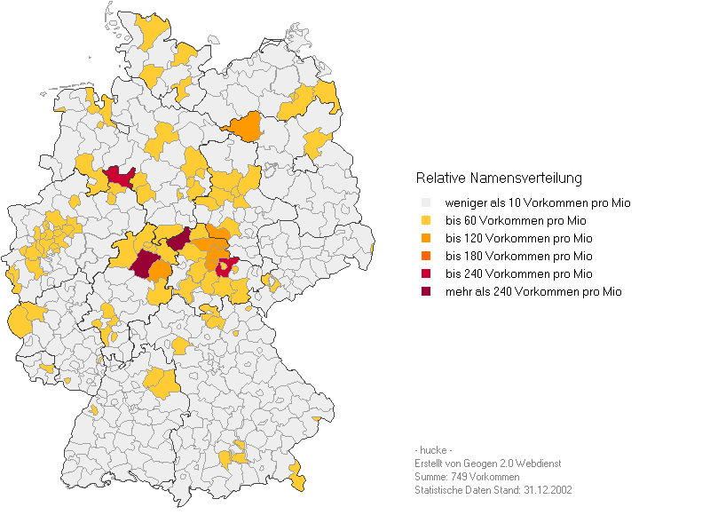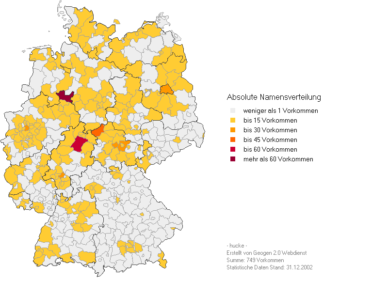![]() Wenn man die Bevölkerungsdichte verrechnet, findet man die meisten Hucke im Landkreis Eichsfeld, nämlich 293 Anschlüsse pro Million Einwohner. Fast verschwunden ist die Familie aus der Kreisfreien Stadt Stuttgart, hier treten pro Million Einwohner die wenigsten auf. Relative Darstellung Die meisten Hucke findet man im Landkreis Minden-Lübbecke, nämlich genau 65 Telefonanschlüsse. Etwas länger suchen muss man dagegen im Bördekreis, hier wohnen die wenigsten: gerade einmal 1. (Beachten Sie, dass Metropolen diese Lokalisierung verfälschen können) Absolute Darstellung |